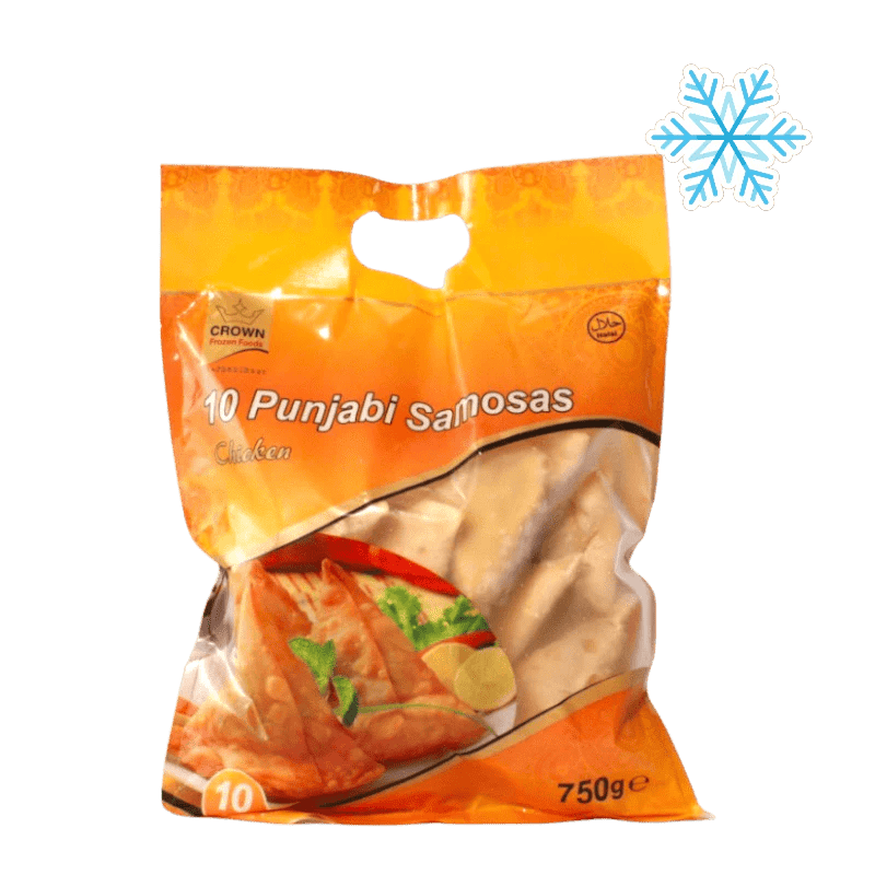 Crown Chicken Punjabi Samosa 750g includes ten crispy samosas stuffed with juicy minced chicken seasoned with aromatic spices. Perfect as appetizers, snacks, or catering starters. Oven- or air-fryer-friendly, these samosas bring authentic Indian flavor.