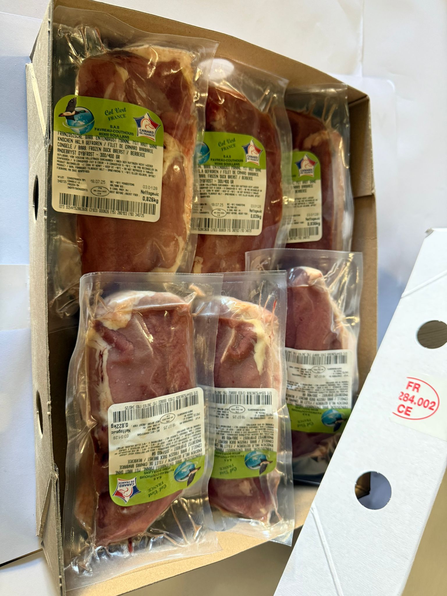 Premium French Barbarie duck breast with skin, boneless, and frozen. Rich flavor, ideal for gourmet cuisine.