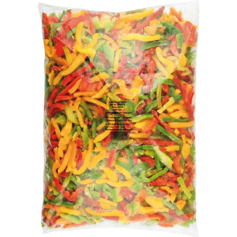 Paprikastreifen Bunt 2.5kg offers a vibrant mix of red, yellow, and green pepper strips. Perfect for stir-fries, pizzas, and mixed vegetable dishes.