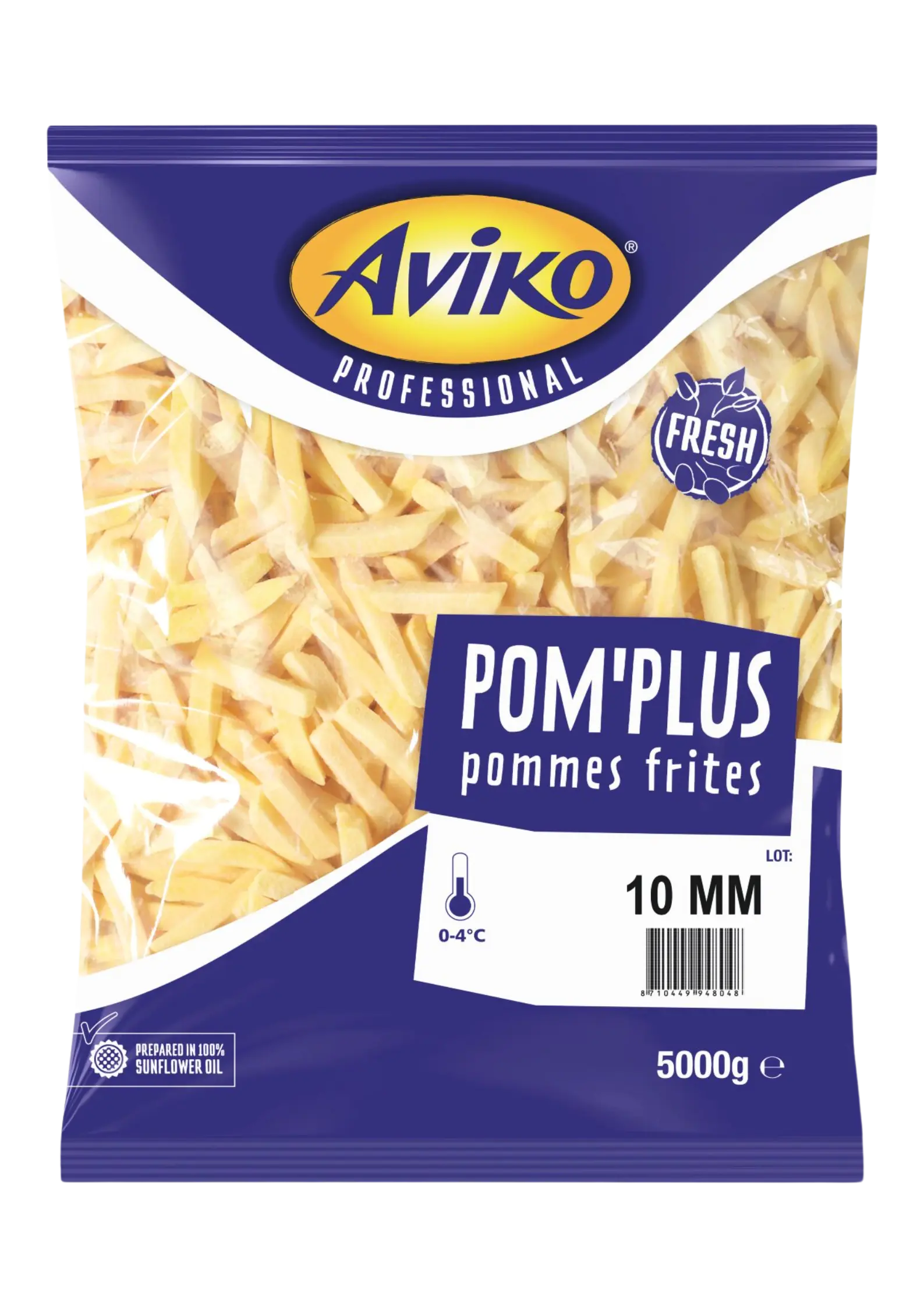 Pommes Aviko frisch 10mm 5kg offer classic fries made from premium potatoes, freshly cut and ready to cook. Their uniform size ensures even frying and consistent results. Perfect for restaurants, canteens, and fast-food outlets, they provide an authentic homemade taste with minimal preparation. These fries retain crispiness and color even during service.