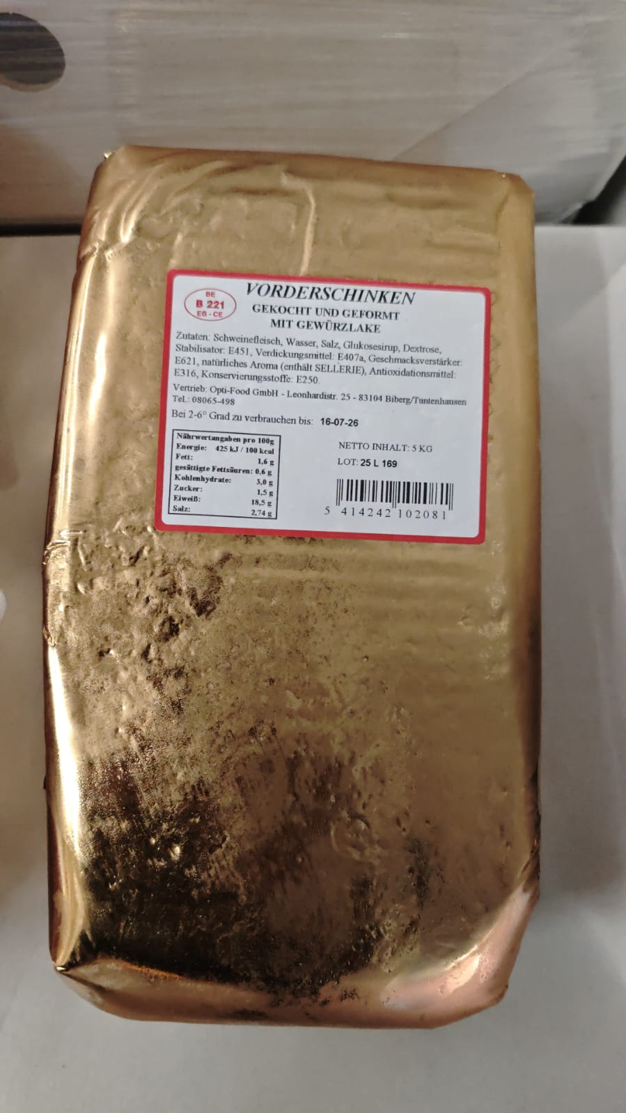 Vorderschinken offers premium front ham crafted from 100% pork meat. Known for its mild taste and firm texture, it’s ideal for sandwiches, wraps, or hot dishes. The rectangular 5kg block provides uniform slices and minimal trimming loss. Its delicate balance of flavor and moisture retention makes it a reliable ingredient for professional kitchens, catering companies, and restaurants. Processed to meet top foodservice standards for taste and freshness.